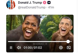 In 1:02 seconds Trump lies about elections, covets a spot on Mt. Rushmore -- and portrays Barack and Michelle Obama as monkeys, maybe the most…