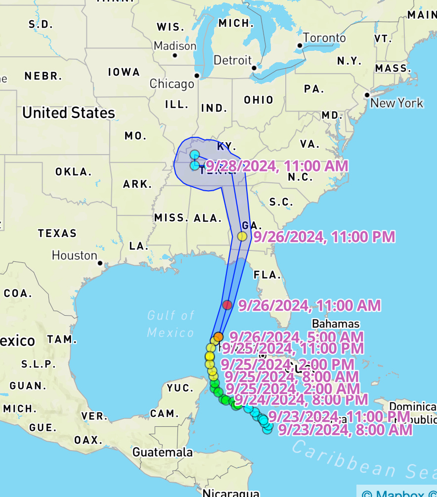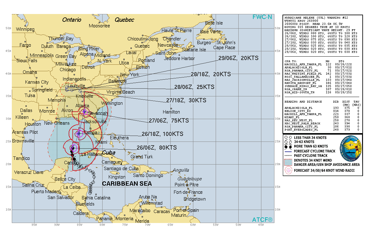 HEADS UP!!!!!!! Here is the U.S. Navy’s track for Hurricane Helene. Note that the wind cones bulge on the RIGHT side of the storm — which they always do in the Northern Hemisphere — and how the intense this storm is going to be for Florida. Also, hurricanes that landfall from the Gulf carry more tornadoes than Atlantic land-falling storms do—more instability in the atmosphere to begin with—so there will potentially be even more damage than there would have been had the storm come in from the cooler-water ocean side. THE STORM WILL LANDFALL AT 11:00 P.M. EASTERN TIME —and hurricane winds can begin as much as three hours ahead of landfall. …