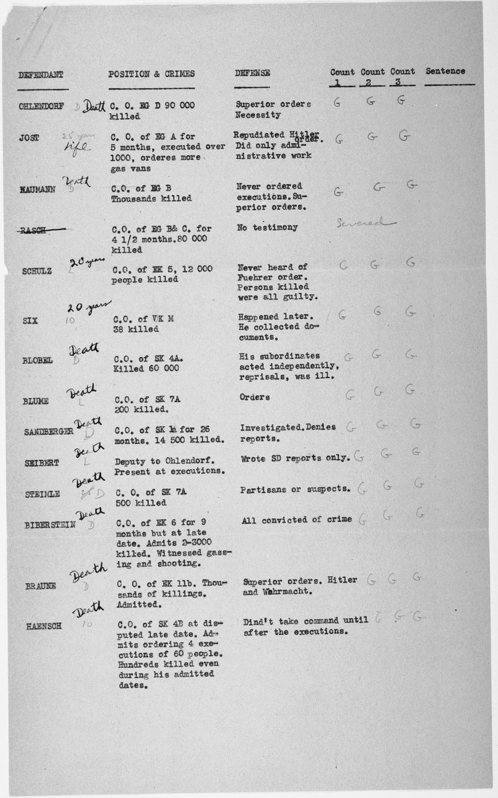Each of the twelve Subsequent Trials involved defendants from individual “strands” of the Nazi state—industrialists, jurists, doctors, civil servants. One strand was the Einsatzgruppen—the mobile Nazi killing units that had operated in Eastern Europe. Ferencz had investigated and exposed them himself.
