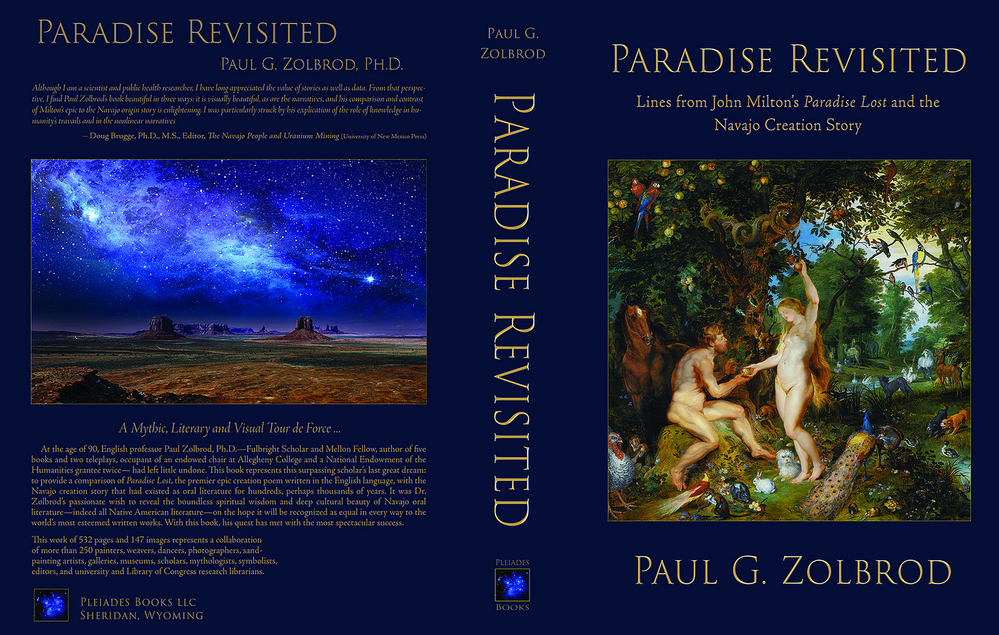 At age 90, Paul began to explore the idea of comparing the Navajo creation story with John Milton’s Paradise Lost largely for one reason: to establish the status of Native American oral literature as being on an equal footing with any of the great epics produced by cultures with alphabetic writing. It is the first such comparison ever made, and it is also the only one that challenges the assumption that alphabetic history and literature must be superior to the works that are passed on by ceremonial enactment, petroglyph, pictograph, chant, oral recitation and weavings. This, the final work of Dr. Zolbrod, offers the world profound evidence of the mythic equality and epic depth of oral literature and, as he writes in his Conclusion, provides a healthier way to perceive and relate to the ecosystem that the Navajo experience as sentient and sacred. It also demonstrates a way to interact with women that honors their equality and full worth.