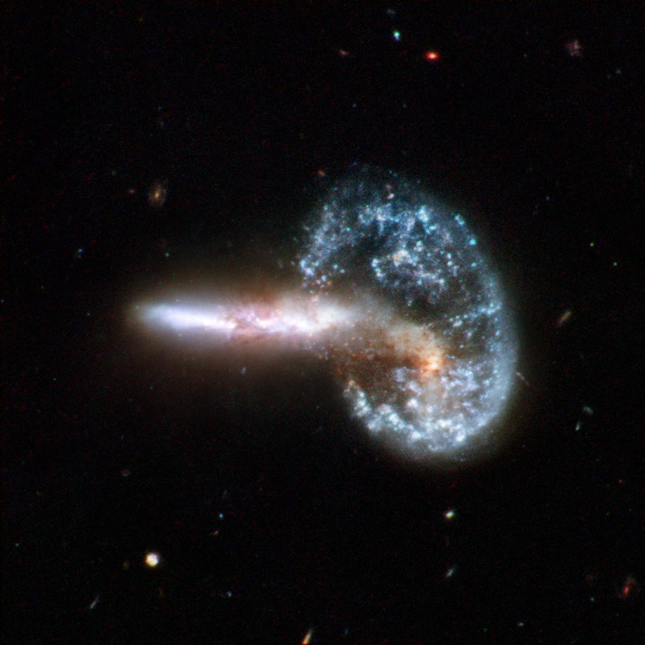 Writes NASA: Arp 148 is the staggering aftermath of an encounter between two galaxies. … The collision between the two parent galaxies produced a shockwave effect that first drew matter into the center and then caused it to propagate outwards in a ring. The elongated companion perpendicular to the ring suggests that Arp 148 is a unique snapshot of an ongoing collision. Arp 148 is nicknamed Mayall's object and is located in the constellation of Ursa Major, the Great Bear, approximately 500 million light-years away. Image: NASA. Public domain.