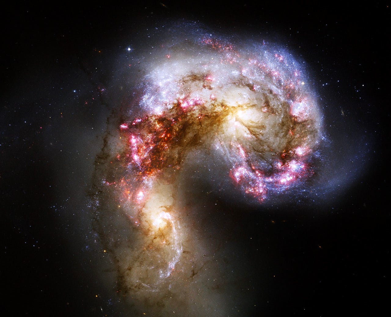 The collision of NGC 4038 and NGC 4039 near the constellation Corvus, 60 million light-years from Earth, will take hundreds of billions of years to play out. This Hubble close-up is roughly 50,000 light-years across. Its extended structures arc outwards for hundreds of thousands of light-years. Image: NASA. Public domain.