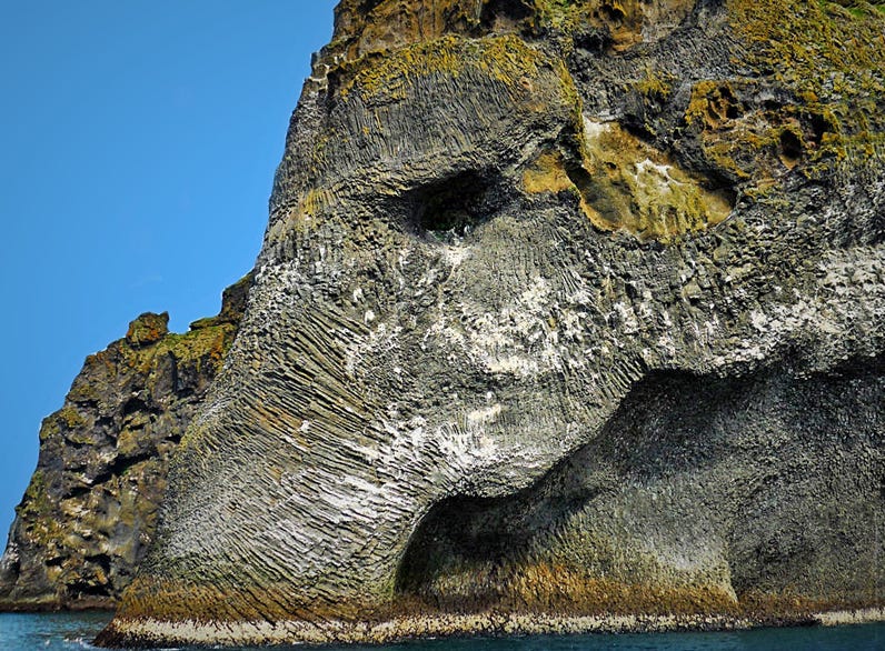 This is the Elephant Rock in Iceland, in the Vestmannaeyjar (Westman Islands), an archipelago off the southern coast of Iceland. For centuries or millennia, volcanic eruptions shaped these islands, including its largest, Heimaey, which means "Home Island." It is the only island in the archipelago with a permanent human population (4,000 people).