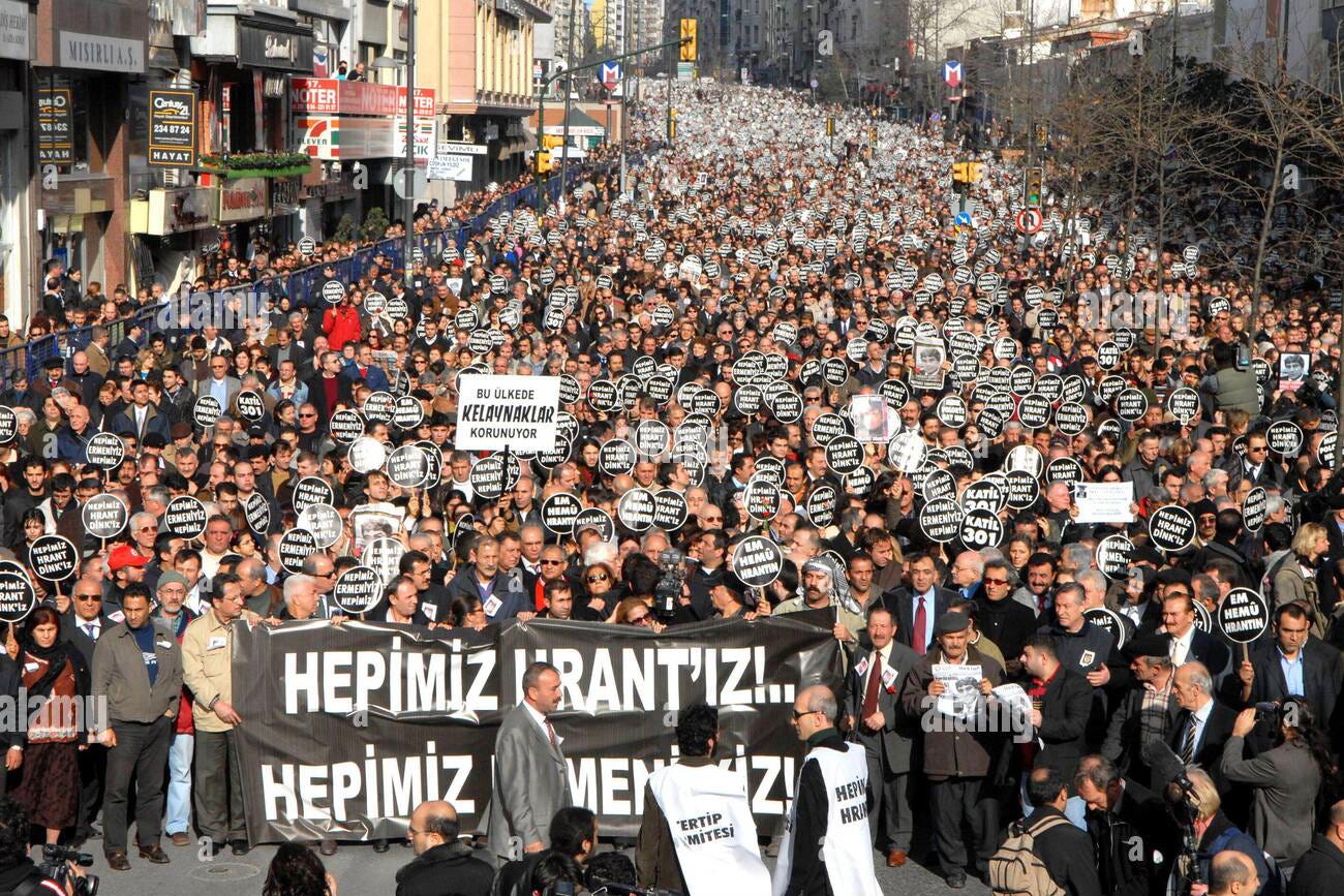Dink, then 52, was assassinated in Istanbul on January 19, 2007 by 17-year-old Turkish radical nationalist Ogün Samast, who shot the journalist in the head three times. Dink died instantly. That was horrific. What came next was even worse. Photographs of Samast, the killer, standing in front of the Turkish flag—and flanked by smiling Turkish police and gendarmerie—leaked out and sparked an immense scandal in Turkey. Samast was tried and convicted and sentenced to 22 years in prison. The law enforcement officers in the selfies were expelled from government.