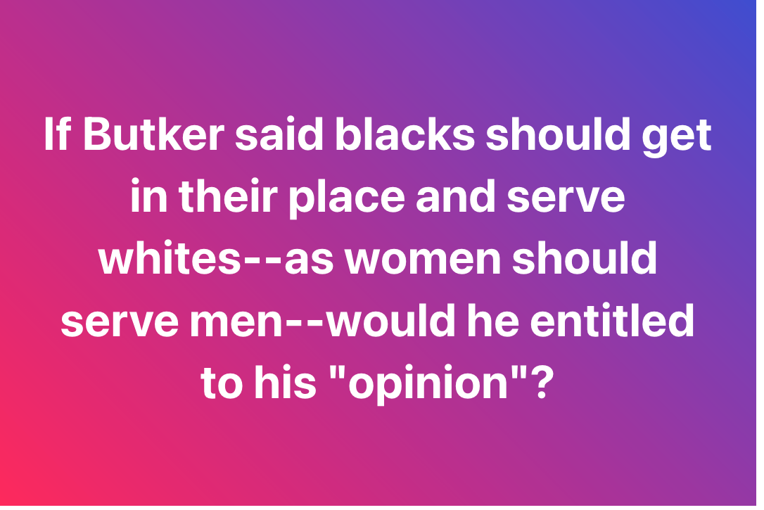 But hate speech—speech that denigrates LBGTQ+ people or advocates for a circumscribed life for the entire gender of women—should be defended by nobody. It is unconscionable for Butker’s teammates to engage in the kind of reductionism that says, “Well, he’s nice around me! Hard worker! Great teammate!” Well, don’t look now guys, and NFL wifies, but this guy is a bigot with a long list of whiny complaints about his masculinity, for which he blames women (and mommy), and has a shopping list of rules and regulations for what women do with their bodies and an allegedly God-endorsed set of restrictions on what she’s to do with her life, i.e., don’t compete with him, don’t have a career, and stay home and keep good house, take care of the kids, and do all the damned cleaning.
