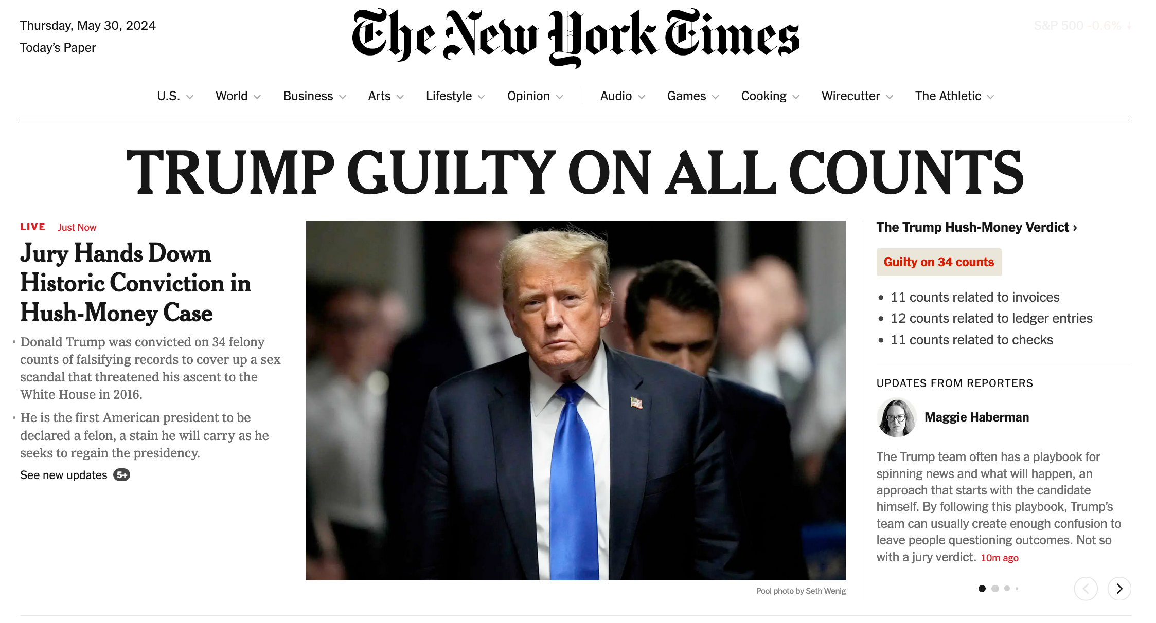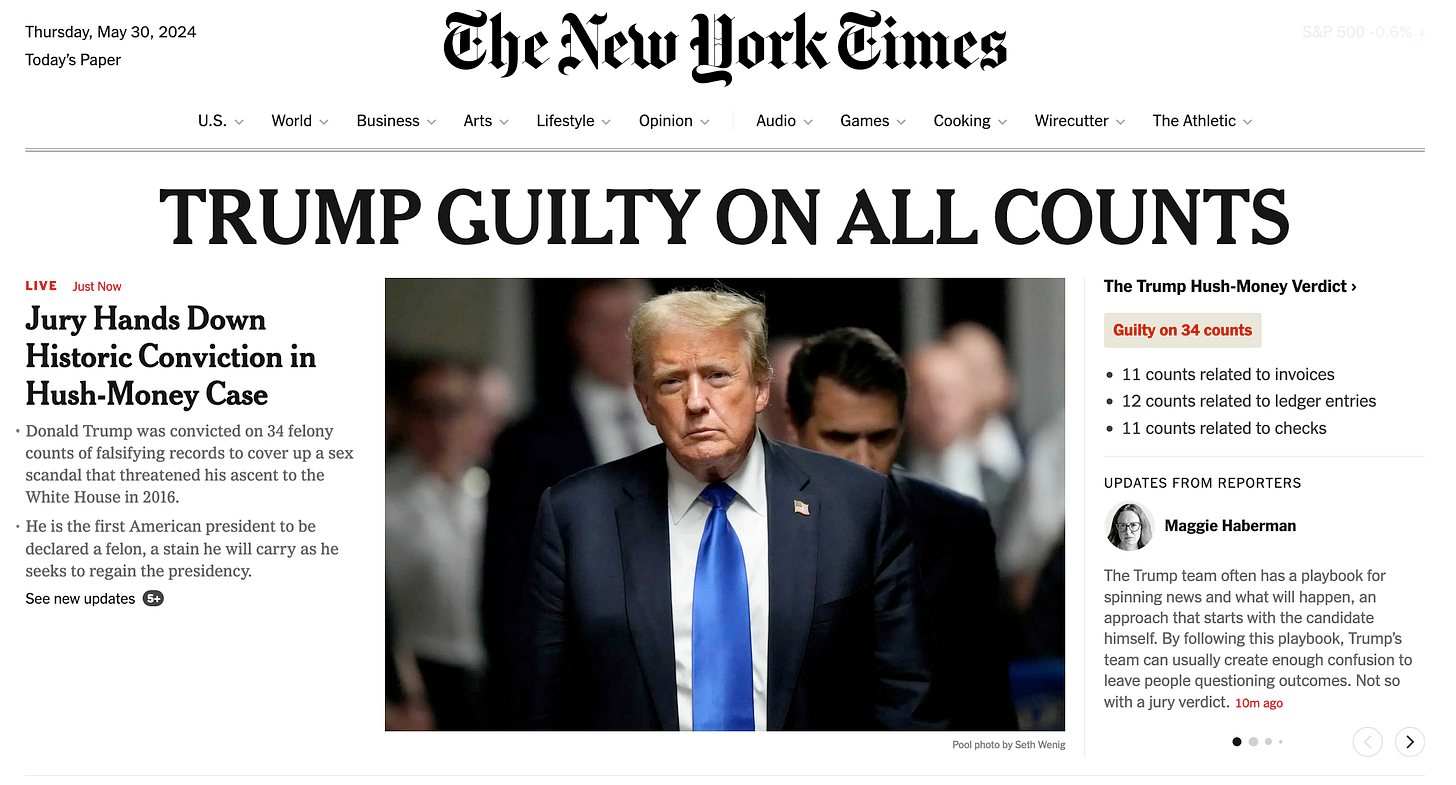 Donald Trump is now a convicted felon. If he were a sitting U.S. Senator or U.S. Representative, he would be forced from office instantly and barred from running. But there are no rules for this at the presidential level. So this is likely not over. And Trump says it’s “not nearly over,” but it *IS* a matter of historical fact.